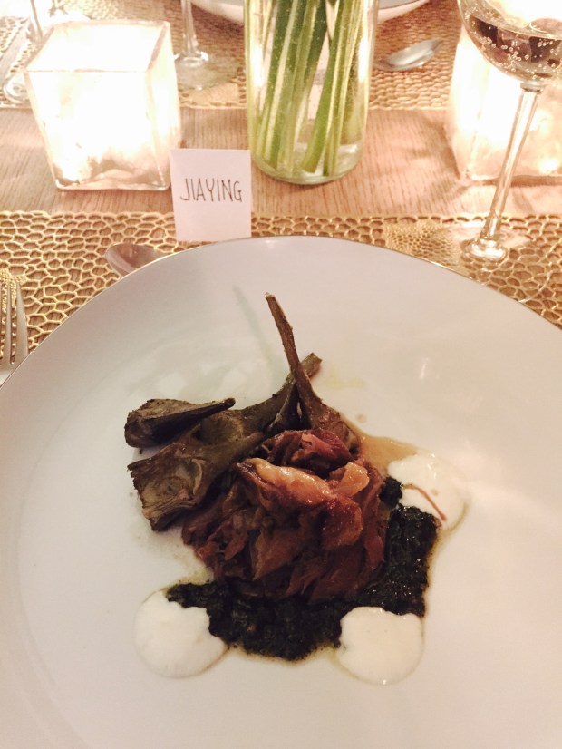 Spring time arrived fashionably late in New York City. At the farmers market however, spring is in full bloom. Make sure to pick up some asparagus and spring lamb on the way home – they are most delicious right about now. For our spring menu, we organized our first pop-up event at Chef Bryan’s very own rad pad on the Upper East Side.Deeply inspired by the season, Chef Bryan created a delightful range of flavors: fresh asparagus with creamy poached egg, celery heart and feta cheese, roasted spring lamb with young artichokes and mint pesto, and a rich earl grey cheese cake with blueberry dust.